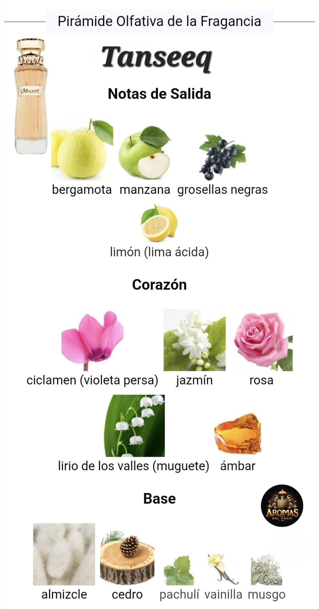 Tanseeq es una fragancia refinada y versátil 🌿🌸, diseñada para quienes buscan un aroma lujoso que equilibre frescura, sensualidad y calidez. Ideal para cualquier ocasión, desde un día casual hasta una noche elegante. 🕊️🌙
